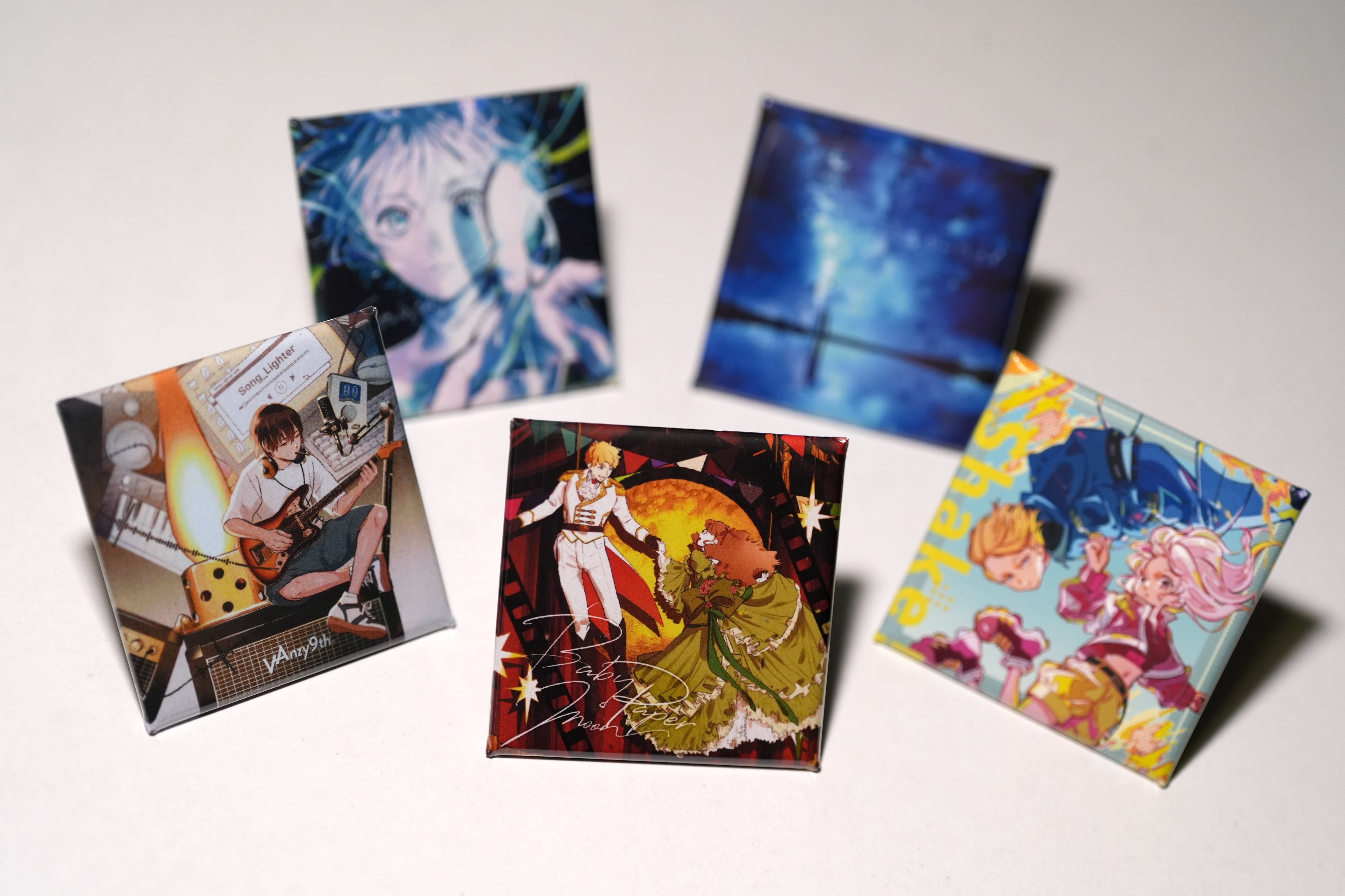 VAnzy9thのジャケ缶バッジ5種セットは、配信リリースされたシングル曲のジャケットデザインを採用した缶バッジアイテムです。正方形のフォルム(40×40mm)で、安全ピンタイプのため、服やバッグに簡単に取り付けできます。スチールとPETフィルムを用いた高品質な仕上がりは、耐久性にも優れ、長く愛用していただけます。ぜひ、お気に入りのバッジで個性を表現してみてください!